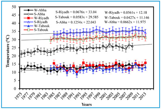 Linear trends of mean temperature in winter (W) and summer (S) for Riyadh, Tabouk and Abha representing the central, north and southwest regions (1984–2013); S-Riyadh: summer for Riyadh; W-Riyadh: winter for Riyadh; S-Tabouk: summer for Tabouk; W-Tabouk: winter for Tabouk; S-Abha: summer for Abha; W-Abha: winter for Abha.