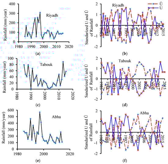 The future trends were assessed for the annual rainfall in Riyadh, Tabouk and Abha. The data did not show any trend in the central and north regions (Table 3) and were supported by the low Kendall’s tau (−0.075 and −0.076 respectively). The southwest region showed decreasing trend (p-value = 0.005), which was also supported by the large negative S (S = −157) and negative Kendall’s tau (−0.361) (Table 3). The linear and sequential version of M–K trends (U and Û) for Riyadh, Tabouk and Abha are shown in Figure 5a–f. In Riyadh, no consistent trend was observed (Figure 5a) with increasing trend during 1992–1997 and 2006–2010, and decreasing trends during 1985–1992 and 2010–2015 (Figure 5a,b). In Tabouk, no consistent trend was also observed with decreasing trend during 1985–2003 and increasing trend during 2004–2015 (Figure 5c,d). The rainfall in Abha (southwest region) showed an overall decreasing trend (Figure 5e). The sequential plot (Figure 5f) showed an increasing trend during 1988–1997 and 2004–2005. However, during 1998–2003, 2006–2009 and 2010–2012, rainfall showed decreasing trends. Overall, multiple trends were observed in all regions during the data periods. However, the overall rainfall in Abha has been reduced in the recent years and was also evidenced by the reduction in the natural vegetation [25].