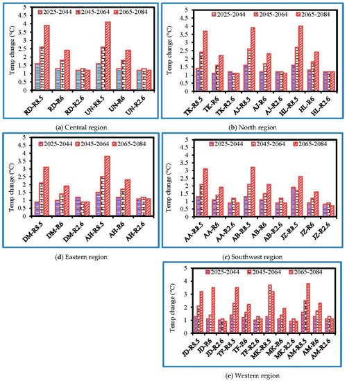 Prediction of temperature change with respect to the reference period (1986–2005). (a) Central region; (b) North region; (c) Southwest region; (d) Eastern region; (e) Western region; RD: Riyadh; UN: Unaizah; TK: Tabouk; AJ: Al-Jouf; HL: Hail; AA: Abha; AB: Al-Baha; JZ: Jazan; DM: Dammam; AH: Al-Hofuf; JD: Jeddah; TF: Taif; MK: Makkah; AM: Al-Madinah; R8.5: RCP8.5 (High emission scenario); R6: RCP6 (High-medium emission scenario); R2.6: RCP2.6 (Low emission scenario).