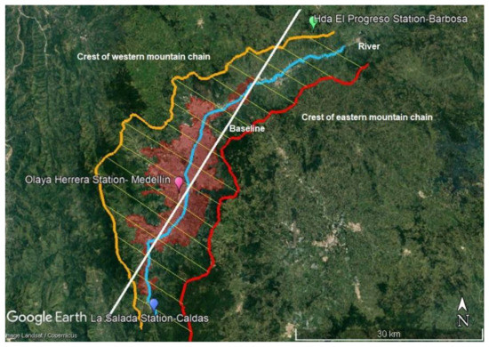 In Figure 1, three irregular lines are observed, two representing the crests of the mountain ranges on each side of the valley, and a third one, the river that runs through the middle of the valley. A fourth and straight line is a reference, called “baseline”, which is formed by joining a point in the south west with coordinates 6°02′18.51″ North 75°41′38.70″ West with a point in the north east with coordinates 6°28′47.19″ North 75°24′58.90″ West. This line serves as the axis for the location of distances from the southern to the northern extremes of the valley, and following the direction of the flow of the river. The figure also shows clear demarcated reddish shade urban areas. The position of the three measuring stations is also displayed. These correspond to meteorological measurement points and are the only stations in the region that have the historical data necessary for the study to be performed. The station Hacienda el Progreso is located in Barbosa, which is an area rural in nature and is the place where the winds enter the valley. The station at the Olaya Herrera Airport, which is located in the center of the valley, corresponds to an urban area, and finally, the station La Salada in Caldas, which is a more rural area and at a higher elevation than the previous two, so it is cooler; here, the wind leaves the valley.