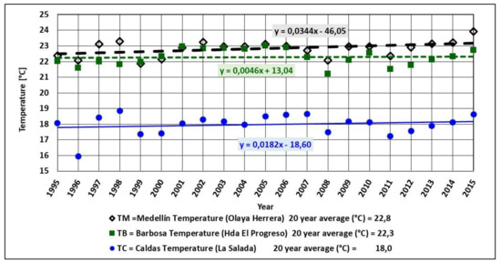 The main variable to be studied, temperature, is collected from IDEAM, a reliable data source, “a public institution of technical and scientific support to the National Environmental System, which generates knowledge, produces reliable, consistent, and timely information, on the state and dynamics of natural resources and the environment” [22] This is the national office responsible of scientific data on climate. Historical data was obtained for the three stations mentioned above. The model considers the average annual temperature. Figure 2 shows the evolution over time for the three measuring stations and their linear adjustment. The shown linear correlations allow for observing tendencies and trends.