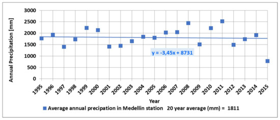 The rains were characterized based on the annual precipitation at the Olaya Herrera Airport station; data is obtained from the IDEAM database. This variable is relevant because it is related to local variations in the temperatures, among others, because of the energy exchanges that are associated with the evaporation of rainwater. Figure 3 shows the behavior in the study period, significant annual variations are observed, with a relatively stable average trend during the 20 years, around 1810 mm, with a very slight increase in time.