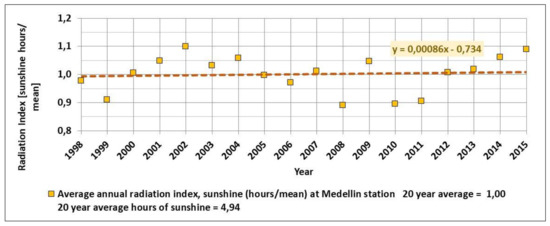 This variable is measured by the IDEAM at the Olaya Herrera station, as the daily hours of solar brightness. For the study, the annual daily averages are considered and have been compared with the average of the study time, which for the period of available measurements (since 1998) was 4.94 h daily. The result of the ratio between the average value of each year and this average of all of the measurements has been taken as an indicator of solar brightness, which is related to solar incident radiation in the region. In Table 1 the values between 1995 and 1998 were estimated based on a correlation between average temperature and sunshine duration. This variable was taken as indicating solar radiation effects. Figure 4 shows the behavior