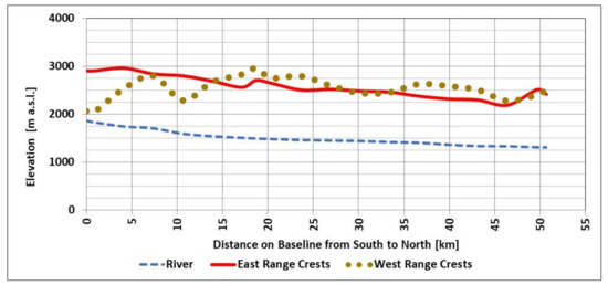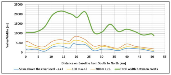 An analysis of the width of the valley was made at different elevations, 50, 100, and 200 m above the level of the river, as well as in the ridges of the mountain ranges that form the valley. This was done for different points following the already described reference line that connects the two reference points of the valley from south to north. It can be seen in Figure 7 that the valley it is relatively enclosed, with total areas of 108 km2 in the flat zone near the river with less than 50 m above the level of the same, of 166 km2 in the zone of less than 100 m above the level of the River, of 227 km2 for the zones of less than 200 m above the level of the river and of 718 km2 between the ridges of the two mountain ranges that form the valley. The fact that the valley is a box-like system allows for it to be seen as a control volume from the point of view of mass and energy flows, in which mountains act as clear boundaries through which energy and air do not flow significantly. On the other hand, the southern and northern ends are inlets and outflows, especially if is taken into account that the winds have predominant directions from the north, following the direction opposite to the flow of the river.