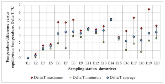 Temperature difference versus equilibrium for the river in each of the measuring stations E1 to E20, Figure built with the same data that was used in reference [24].