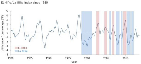 Global annual temperatures of the earth surface (°F), compared against the average 1901 to 2000 (dotted line passing through zero), data from American National Oceanic and Atmospheric Administration (NOAA’s) National Climatic Data Center. The impacts of the Niño (increases) and the Niña (decreases) phenomena are observed [36].