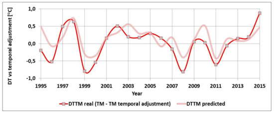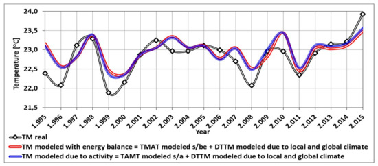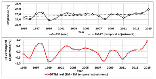 On the one hand, there are the impacts of phenomena of a global nature, which in principle are distributed all around the planet, with certain geographic variations. Global delta temperatures are taken from the information provided by American National Oceanic and Atmospheric Administration (NOAA’s) National Climatic Data Center [36] and are defined as the difference between Global annual temperatures of the earth’s surface and the temperature average 1901 to 2000. Figure 9 shows this data provided by the NOAA’s National Climatic Data Center, with global temperatures of the surface of the earth, compared against the average between 1901 and 2000 (dotted line passing through zero). The impacts of the Niño (increases) and the Niña (decreases) phenomena are observed. Niña and Niño are names customarily used for these warming and cooling periods. From 1995 to 2015, on average, an increase is not observed, but rather some decrease is noted. Figure 10 shows the behavior of such global temperatures when compared to those of the studied region in the Aburrá Valley. For this purpose, the data has been processed in the following way: