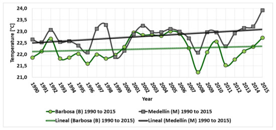 Figure 2 shows the average annual temperatures for the three stations: Barbosa (Hda el Progreso), Medellín (Olaya Herrera), and Caldas (La Salada), and their respective linear trends between 1995 and 2015. The Medellín station, corresponding to the central zone of the Medellin city, shows the correlation with a higher increase tendency. The Barbosa station, which is situated in a rural area, upwind from the urban areas, shows a very stable tendency, with very small change. The Caldas station, which is situated in an area of mixed rural and urban background and downwind from the main urban settlements, shows a linear increasing trend, but is less significant than the one for the Medellín station.