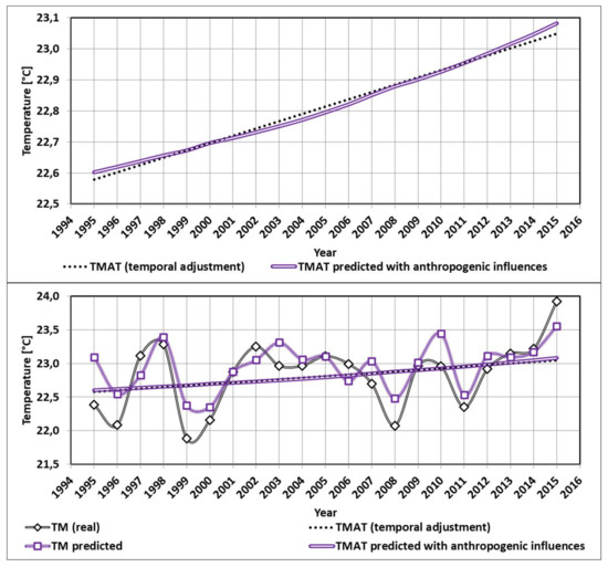 In short, increases in mean temperature based on linear trends were found, they were estimated at 0.47 °C in the 20 years that were studied from 1995 to 2015, of which 60% is as a result of local activity and 40% due to impact of global warming. This is shown in Table 11; however, it is a complex behavior that shows increases and decreases and is not uniform in the three stations studied.