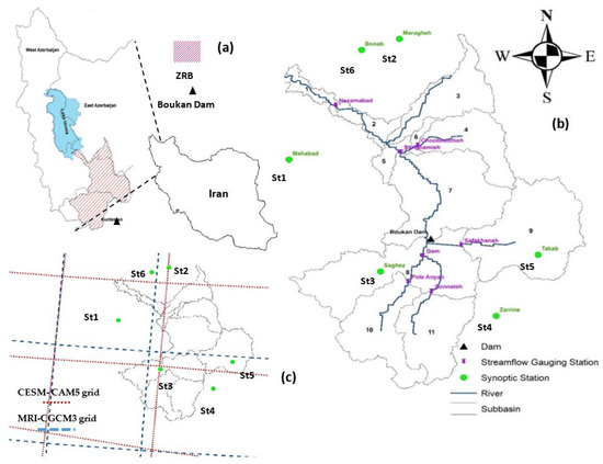 Map of the Zarrine River Basin (ZRB) in north-western Iran (a), the basin configuration of Soil and Water Assessment Tool (SWAT) with climate- and streamflow-gauging stations (b), and selected general circulation model (GCM) grid cells for the quantile mapping (QM) model (c).