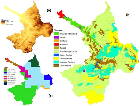 Digital elevation model (DEM) (a), classified land-use map (b), and Food and Agriculture Organization (FAO)-based soil map of the ZRB (c).