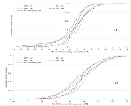 Cumulative distribution functions (CDFs) of the GCM raw and observed min temperatures for station St2 in the calibration and validation period compared with the bias-corrected min. temperature in the validation period for months in March (a) and July (b).