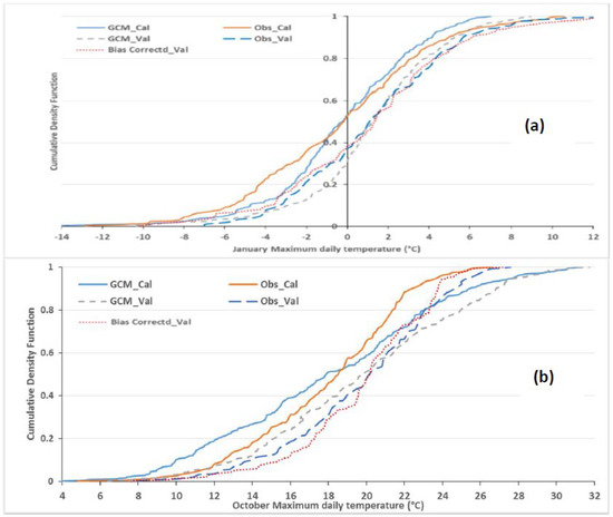 After applying the CTj and CPj correction factors (j = 1 to 12, number of months in a year; n = 19, total number of years) in Equations (5)–(7), the monthly biases of the GCM simulated climate variables are removed and then the QM-model is calibrated and validated for each month of the year on the daily time step during the period of 1987–2005, with 1987–1998 as the calibration and the remainder as the validation period. This is done for each of the six climate stations. The CDFs of the min. temperatures resulting from the various bias corrections steps, as epitomized in Equations (4) and (6), are shown representatively for St2 station for the months March and July in the two panels of Figure 3. Corresponding plots for the max. temperature at St4 station for January and October are presented in Figure 4.