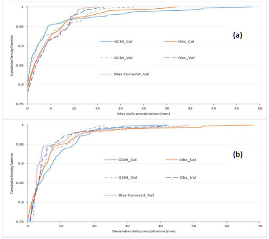 It should also be noted that the CDF of the bias-corrected variable in the calibration period is not shown in the figures, as it approximately overlaps with the CDF of “obs_Cal”, as it should.