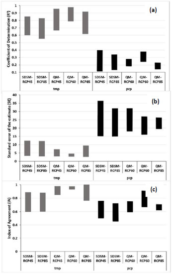 As the historic observed climate data at the synoptic stations (Figure 1b) were only available from 1987 to 2015, the reliability of the GCM/SDSM/QM predicted min./max. temperatures and precipitation for the period 2006–2015 is evaluated by comparing them with the observed data. To that avail, the goodness-of-fit measures, coefficient of determination (R2), standard error (SE) and index of agreement (IA) (defined as (1—standardized RMSE (Equation (3))) and so varying between 0 and 1 [44]) are computed for each climate station and the range of values is presented for the various combinations of downscaling methods/RCP-scenarios for the average of the min. and max. daily temperatures and the daily precipitation in the three plots of Figure 6. One may notice from these plots that the efficiency of the QM and SDSM methods is overall satisfactory, but the QM performs clearly much better than SDSM in the 2006–2016 evaluation period.