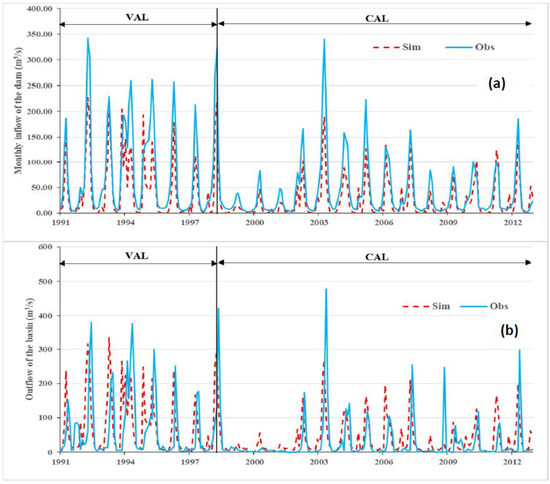 The SWAT-simulated monthly inflow to the Boukan Dam (the discharge at the outlet of sub-basin 8) and the main outflow of the basin (the discharge at the outlet of sub-basin 2, station Nezambad) are compared with the observed records in Figure 8 for the calibration (1998–2012) and validation period (1991–1997). It should be noted that the calibration and validation are done on the monthly scale because of the unavailability of daily data. Also, the first 4 years of the validation period (1987–1990) are used for the warm-up of the SWAT model. Figure 8 shows that the performance of the SWAT simulation for both the calibration and validation periods is quite satisfactory, although some peaks are underestimated which is mainly because of the occurrence of the some dry years with low precipitation, especially, during 1998–2002.