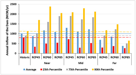 Statistics of the simulated inflow of the dam in the historical (1991–2012) period and the three future (near, mid and far) periods in terms of the 25th, 75th, 90th percentiles and the average.