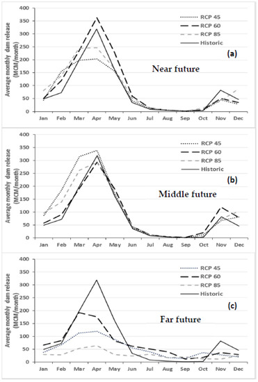 SWAT-simulated average monthly dam water releases for near (a), middle (b) and far (c) future periods/scenarios in comparison with the historical (observed) water releases.