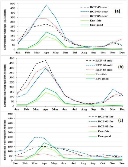 As can be seen from the top and middle panels of that figure, for the near- and middle-future periods the environmental rights will be satisfied at both “fair” and “good” levels for all RCPs, whereas in the far-future period (bottom panel), the river discharge will not meet the environmental demands at “fair” and “good” suitability levels during months March to June for the extreme RCP85 scenario and fails also to supply the demands in April and May for scenario RCP45. However, the demand is at least satisfied at the “fair” level for the middle future/RCP45 scenario. In contrast, for the more benevolent far future/RCP60 scenario, the regulated environmental flow will be satisfied at both “good” and “fair” levels.
