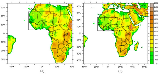 The Abdus Salam International Centre for Theoretical Physics Regional Climate Model version 4.4 (RegCM4.4) is a hydrostatic model with dynamic characteristics and different physics options. RegCM4.4 has demonstrated robust capability in the simulation of the mean climate over different regions [37,38,39,40], and is therefore useful for climate projections and paleoclimate studies. The model has 18 vertical sigma levels extending from the surface to 50 hPa level, and provides different options for cumulus convection parameterizations and land surface schemes. A detailed description of the model is presented in References [41,42]. However, the Emmanuel scheme [43] and the Grell convective scheme [44] were adopted based on their suitability in the simulation of tropical convection [41,45]. RegCM4.4 was synchronously coupled to the National Center for Atmospheric Research Community Land Model version 4.5 (CLM4.5) in this study based on its capability to either simulate vegetation as prescribed (time-invariant; [46]) or dynamic [47]. In the dynamic vegetation option, carbon and nitrogen cycles, plant phenology and mortality, leaf area index, stem area index, and vegetation height are simulated. Similarly, the percentage cover of the different PFTs is simulated at annual time steps, according to specified bio-climatic rules (Table 1). In the CLM4.5 scheme, there are five different land unit types, 15 soil layers, five snow layers, and 16 different PFTs, which represent land surface heterogeneity [34]. The PFTs’ sub-grid level accounts for biogeophysical and biogeochemical differences between broad categories of PFTs. The percentage cover for the prescribed PFTs are derived from Moderate Resolution Imaging Spectroradiometer (MODIS) satellite data, as described in Lawrence et al. [48]. If dynamic vegetation is enabled, the establishment of new PFTs depends on the bioclimatic rules for each PFT, regarding the warmest minimum monthly air temperature and minimum growing days [34]. Also, a minimum precipitation of 100 mm/year is required for the existence of new PFTs, while survival is associated with the coldest minimum monthly air temperature threshold for specific PFTs. In this study, the numerically designed sensitivity to land cover changes for agri-silviculture experiments were carried out using two African domain sizes in a cartographic projection of Normal Mercator. The first domain (Figure 1a) extends from 35° S–35° N and 45° W–40° E, while the more extensive domain (Figure 1b) extends from 45° S–45° N and 42° W–70° E. The more extensive domain size conforms to the Coordinated Regional Climate Downscaling Experiment (CORDEX) recommended domain for Africa [49]. It is known that regional climate models are sensitive to domain sizes [50,51]. Hence, the choice of two domains to examine the sensitivity of the dynamic vegetation simulations to different domain sizes. The model configurations are summarized in Table 2.