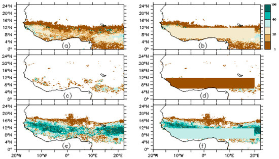 Simulated changes in PFTs between the years 1980 and 2004. Tropical broadleaf evergreen tree (a,b); tropical broadleaf deciduous tree (c,d); and C4 grass (e,f). The upper row represents the PRESd1 experiment, and the lower row represents the PRESd2 experiment.