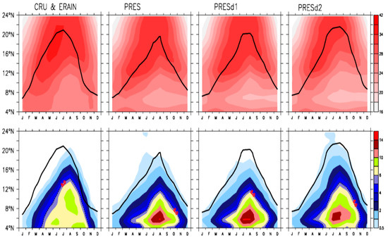 The time-latitude cross-section of temperature and precipitation average over the West Africa region between 15° E and 15° W for CRU observations, and the three RegCM4.4 simulations of historical climate are presented in Figure 4. The model, irrespective of the domain size or vegetation state (i.e., prescribed or dynamic) reproduced reasonably well the latitudinal distribution of temperature over West Africa. The peak position of the continental ITCZ over areas of maximum temperature in June and July was fully captured in PRES, PRESd1, and PRESd2 simulations. According to Reference [59], West Africa monsoon precipitation exhibits three distinct phases identified as the onset, peak, and cessation periods. The CRU observations of the historical climate identified the commencement of the onset period in April, and a vertical northward displacement of peak periods from 5° N in May/June to 8° N in August/September. Afterward, the cessation period commenced in October, with a southward retreat of the rain belt. However, the model’s historical simulations identified the onset period by a lag of 7–8 weeks in May/June, and did not capture the northward jump in the monsoon precipitation. The model’s delay in capturing the onset dates also correspond to its inability in the representation of the abrupt shift in precipitation observed from 5° N to 8° N. The spatiotemporal distribution of temperature, precipitation, and wind in PRES, PRESd1, and PRESd2 experiments were compared to observation and reanalysis data (Figure 5a,b). The simulated minimum temperature along the West African coast and maximum precipitation over the orographic region of the Guinea Highlands, Jos Plateau, and Cameroun Mountains during the peak of the monsoon from June to August (JJA), are in good agreement with observation data. Similarly, the transportation of cold, moist, south-westerly winds from the ocean to about 18° N during the peak of the monsoon, as well as the intensification of north-easterly dry winds during winter, was adequately captured in the model.