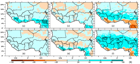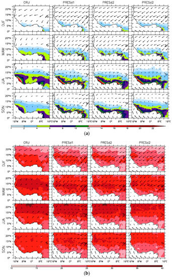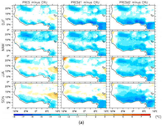Similarly, precipitation along the West African coast was grossly overestimated (higher than 4 mm/day) for June to August (JJA) and September to November (SON) seasons, but underestimated by the same magnitude over the continent (Figure 6b). The pattern of the dry and wet bias was consistent with the temperature biases. The seasonal dry bias in PRES (Figure 6b) was reduced by about 2 mm/day in PRESd1 and PRESd2. The feedback from dynamic vegetation in PRESd1 and PRESd2 contributed partly to the reduction of temperature and precipitation biases in the respective experiments. On the other hand, the warmest bias of 8 °C was found over Western Sahara (approximately 23° N, 16° W) in all three historical simulations from June to August, while the coastal and orographic areas exhibited a cold bias of about 2–4 °C. Similarly, more pronounced wet biases of more than 4 mm/day occurred along the West African coast, but the dry biases were found inland. The magnitude of temperature and precipitation biases in all the seasons was not horizontally homogeneous, but appeared to be more intense over areas with complex terrains (e.g., Guinean Highlands, Cameroon Mountains, and Jos plateau in Nigeria). Previous regional climate model simulations over West Africa reported similar biases [18,30,60,61,62,63,64]. The model biases were associated with different factors, such as the absence of sufficient observing stations in the mountainous region, the influence of land/sea boundary conditions, physics configuration of the model, inherited biases from the driving global circulation models (GCMs), or the choice of cumulus convective parameterization [39,65,66,67].