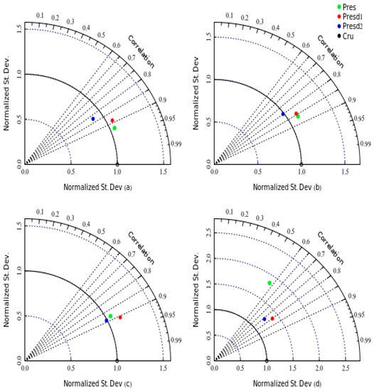 The seasonal variation of precipitation’s amplitude was simulated in PRES, PRESd1, and PRESd2 experiments, and are presented in Figure 9. All three historical climate experiments exhibited strong pattern correlations for precipitation in all of the seasons, irrespective of the domain size or vegetation state. However, the amplitude of variation was overestimated in all of the seasons, except for the MAM season. During the MAM season, the three historical experiments performed reasonably well in the representation of the amplitude of variation in precipitation, with a normalized standard deviation approximately equal to one and a strong correlation. Generally, the PRESd1 experiment showed the most outstanding performance with a high correlation (R = 0.85) and normalized standard deviation closest to observation during the MAM season.
