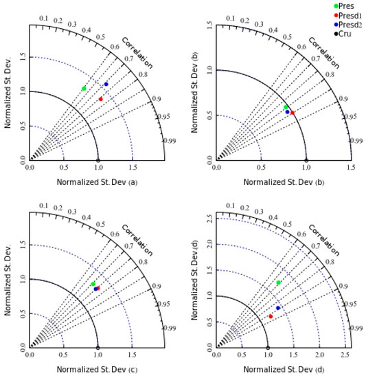 Taylor’s diagram showing the correlation and normalized standard deviations of simulated and observed precipitation (mm/day). The standard deviations and correlations are computed for (a) DJF; (b) MAM; (c) JJA; and (d) SON seasons for the period 1980–2004.