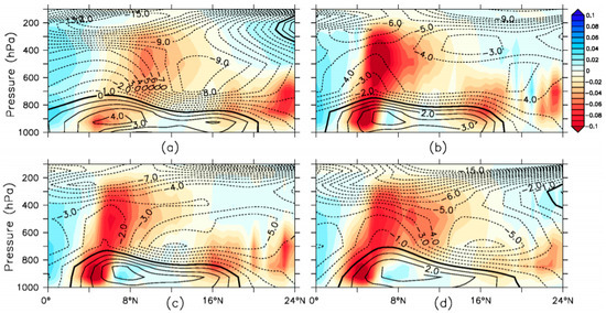 The vertical structure of the zonal winds (m/s) averaged between 10° E and 10° W over West Africa in August for (a) Era-Interim reanalysis; (b) PRES; (c) PRESd1; and (d) PRESd2 experiments. The shadings indicate the corresponding vertical component of the wind (ω, units: Pa/s).