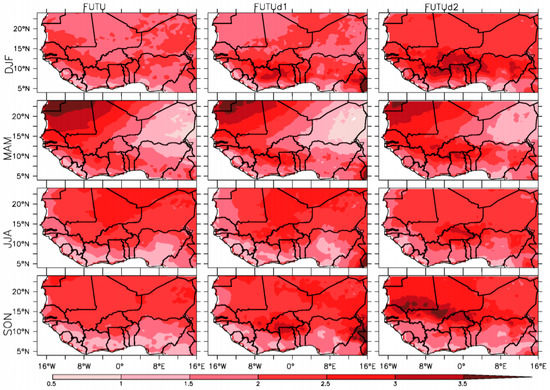 Projected future seasonal changes in temperature (°C; 2030–2054 minus 1980–2004) over West Africa due to agri-silviculture practices along the Guinea Savanna zone simulated in the GUSAG, GUSAGd1, and GUSAGd2 experiments.