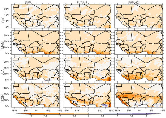 This section presents results of projected future climate change over West Africa as simulated by FUTU, FUTUd1, and FUTUd2 experiments using both prescribed and dynamic vegetation. The differences obtained from the results of future and historical climate simulations provide information on the impact of greenhouse gases (GHG) under RCP 4.5 on some of the simulated climate variables such as precipitation, temperature, winds, evapotranspiration, specific humidity, relative humidity, and sensible heat flux over West Africa. The spatial distribution of the projected future changes in precipitation (Figure 11), temperature (Figure 12), and winds (Figure 13) across West Africa are non-homogeneous in all seasons. The projection of widespread warming across most parts of West Africa persisted in each of the three future climate simulation experiments (FUTU, FUTUd1, and FUTUd2). An increased future warming of 0.5 °C occurred along the coastal and orographic regions (e.g., Guinea Mountains, Cameroon Mountain, and Jos Plateau in Nigeria) during the JJA season, which increased by more than 2 °C further inland during DJF, MAM, and SON seasons (Figure 11). The three different future climate projections agreed to a warmer (increase of 2 °C) climate over the western Sahel zone from March to May (MAM). FUTU, FUTUd1, and FUTUd2 all projected the most significant decrease in precipitation (more than 2 mm/day) over most parts of Liberia and Sierra Leone in JJA and SON (Figure 12). The model projected an increase or decrease of about 1 mm/day in other parts of West Africa all year round. The wetter condition over these areas corresponded with the enhancement of the westerlies north of 14° N in JJA (Figure 13), but the drying condition appeared not to correspond to the changes in the wind circulation over this region. It is somewhat linked to the influence of other local processes or boundary conditions from the driving global climate model.