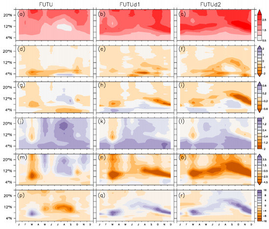 The further analysis of future changes in other surface variables (besides temperature and precipitation) is presented in Figure 14. FUTU simulated warmer future climates in all months, but the least warming (an increase of 0.5 °C) occurred south of latitude 12° N from July to September. With FUTUd1 and FUTUd2, the lowest warming of 1 °C was found south of 8° N from January to December. The three simulations projected a precipitation decrease of more than 2 mm/day over areas south of 8° N in March and October in the FUTU experiment, but were more pronounced from July to August in FUTUd1 and FUTUd2 experiments. The magnitude and latitudinal distribution of changes in evapotranspiration varied among the three simulations. The future latitudinal changes in the distribution of evapotranspiration in the three future experiments appeared to agree jointly with each other, except that FUTUd2 was drier (Figure 13g,i). On the other hand, the projected future increase in atmospheric moisture all year round (Figure 14j,l) over most parts of West Africa was not sufficient to enhance precipitation due to the projected decrease in relative humidity all year round (Figure 14m,o). There was a substantial agreement between the two dynamic vegetation simulations in the projection of an increase in sensible heat flux in all months (Figure 14p,r).