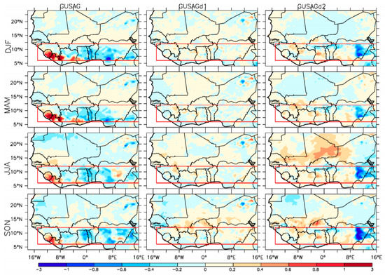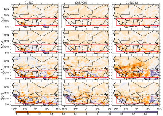 Projected future seasonal changes in precipitation (mm/day; 2030–2054 minus 1980–2004) over West Africa due to agri-silviculture practices along the Guinea Savanna zone simulated in the GUSAG, GUSAGd1, and GUSAGd2 experiments.