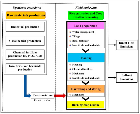System boundary from cradle to farm gate of the study (adapted from Arunrat et al. [48]).