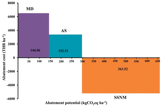 The AAC was used to assess the economic potential for the reduction of GHG emissions in this study; AAC refers to the cost of implementing a technique to reduce GHG emissions to an anticipated level. Similar to the GHG emission estimations, AAC was estimated using four scenarios comprising the BAU case and the use of the MD, AS, and SSNM techniques. The AAC (THB kgCO2eq−1) of each technique was calculated by dividing the total abatement cost (THB ha−1) (TAC) by the total abatement potential (kgCO2eq ha−1) (TAP), and each TAC and TAP were obtained by subtracting the cost under the BAU scenario. Indeed, the reduction of GHG emissions is involved with cropping system, mitigation techniques, and farmers’ behavior. Therefore, ACC was then presented to the farmers of each farm during their assessments on each mitigation technique. This is because ACC can help the farmers to visualize about being environmentally friendly and reducing production costs.