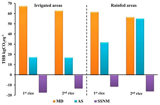 The results of estimates of GHG emissions, abatement potential, and AAC between BAU and the different mitigation techniques are presented in Table 3 and Figure 2 and Figure 3. There were highly significant differences in the first and second cultivations between irrigated and rain-fed areas and for each technique. These results reflect the fact that MD is more appropriate for implementation in irrigated rather than rain-fed areas and more appropriate for the second rice cultivation than for the first cultivation. The AS technique led to a higher abatement potential for the second rice cultivation than for the first one. Meanwhile, SSNM generated a 42.6% higher abatement potential for the second rice cultivation than for the first one, with a 9.8% lower AAC for irrigated than rain-fed areas. However, among all techniques, SSNM was the most appropriate one because its AAC was lower than that for BAU, and it had a 60.2 and 58.1% higher abatement potential than MD and AS, respectively.