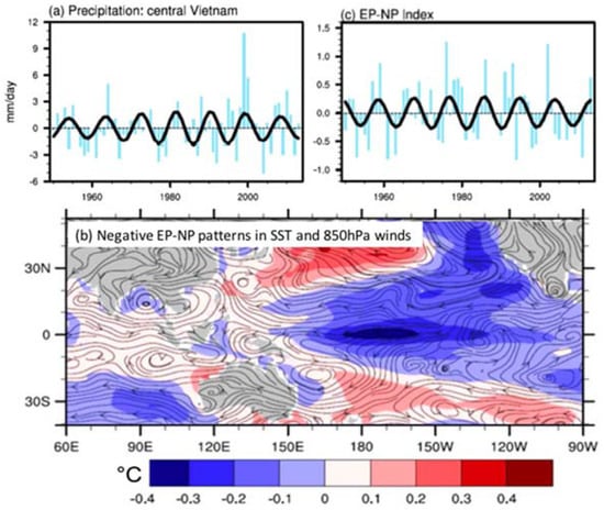 Precipitation in Central Vietnam is characterized by an autumn regime associated with seasonally increased occurrences of tropical cyclones [1,2]. In autumn, Central Vietnam undergoes frequent flooding that poses serious risks to both lives and properties [3,4,5]. Li et al. [1] observed a pronounced decadal oscillation within the 8–11 year frequency revealed from the autumn precipitation in Central Vietnam (Figure 1a), which appears to be modulated by the so-called East Pacific–North Pacific (EP–NP) teleconnection (Figure 1b). The negative phase of the EP–NP pattern is associated with a positive sea surface temperature (SST) anomaly in the South China Sea (SCS) that induces low-level convergence that, in turn, leads to increased precipitation over Central Vietnam. This regional circulation is embedded in a large-scale circulation associated with SST anomalies across the Pacific Ocean, with widespread cooling in the eastern and central tropical Pacific sandwiched by warming in the North, South, and Western Pacific Ocean (Figure 1b). Reversely, the positive phase of the EP–NP features opposite SST and circulation anomalies, leading to reduced rainfall in central Vietnam. The EP–NP index also reveals a pronounced quasi-decadal oscillation (Figure 1c) that is in-sync with the central Vietnam autumn precipitation [1].