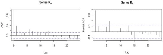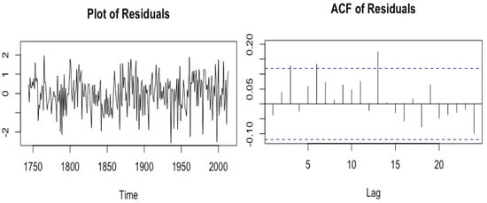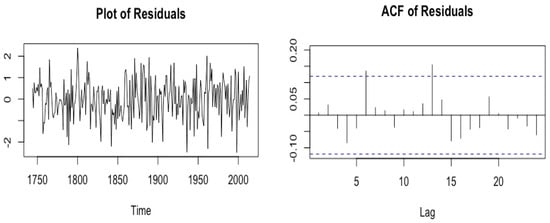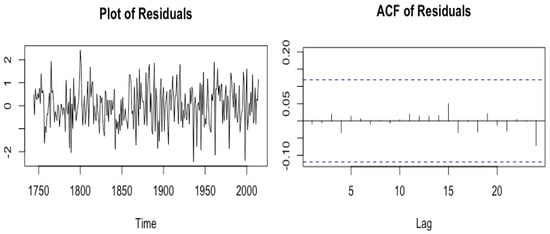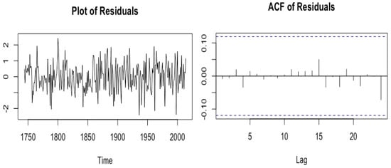 where is a white-noise process with a fixed variance of . Plots of the residuals and their ACF are shown in Figure 4. The autocorrelations are largely removed by the model, with the residuals being very close to white noise. In Figure 5, the model fitted values are plotted along with the 95% confidence interval, in comparison with the observed values. The overall mean squared error (MSE) of fitting is calculated to be 0.8303.