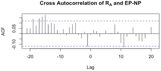 In this paper, we construct various time-series models for predicting (ON rainfall index over Central Vietnam) and compare their performances. The sample autocorrelation function (ACF) and sample partial autocorrelation function (PACF) of are shown in Figure 2. Both functions exhibit significant autocorrelation, based on which a univariate time-series model is developed for , from an autoregressive moving average (ARMA) model. The significant autocorrelations reflect the documented low-frequency/decadal climate variability as noted for Central Vietnam by Reference [1]. In addition, a sparse pattern is shown in the PACF, however the partial autocorrelation is only significant at a few lags such as lag 1, 6, 13, and 15. Thus, we construct a sparse autoregressive (SpsAR) model that utilizes the sparse feature to improve prediction accuracy. Figure 3 plots the sample cross-autocorrelation function (CACF) of the series and EP–NP index, where a significant cross-autocorrelation structure is shown. This motivates us to include EP–NP as an exogenous variable to enhance the univariate model, thus developing an ARMAX (ARMA with exogenous variables) type of model. Finally, a sparse autoregressive with exogenous variables (SpsARX) model is constructed that simultaneously takes advantage of both the sparsity and the exogenous variable referred to as EP–NP.