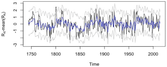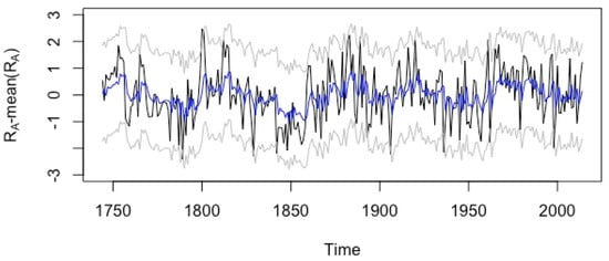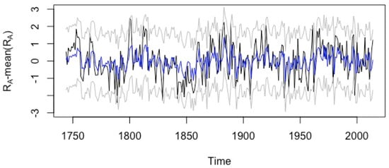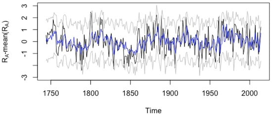 In-sample fitting of the ARMAX (1,0,6) model to the demeaned series of (1744–2014). This figure shows overlaid plots of the observed value (black), model fitted value (blue), and 95% confidence intervals of the fitted value (grey). The mean squared error (MSE) of fitting is 0.7948.