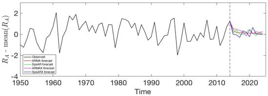 Furthermore, as a reference analysis, we repeated the above cross-validation study to a 50-year validation period. That is, we divided the data into a 221-year training set (1744–1964) and a 50-year validation set (1965–2014), and then calculated the RMSE and MSTE for the predictions over the 50 years. The results are summarized in Table 2. Generally, the errors for the 50-year validation are larger, most probably because of changes in the autocorrelation structures, as a significant portion of the data is taken for validation purposes. Nevertheless, the ranking among the four types of models is consistent with what is shown in Table 1. Especially, SpsARX continues to stand out as the best model, which enhances our finding that the tree-ring record does contribute to the rainfall predictability. Finally, to complete the analysis, Figure 12 shows the forecast values for the years 2015–2024 by the four models.