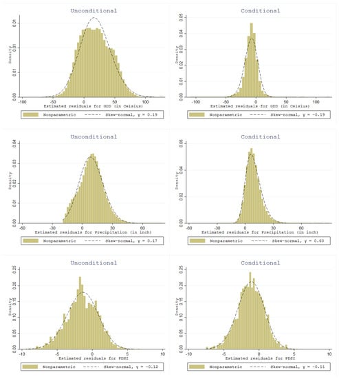 In statistics, the conditional mean or conditional expectation of a random variable is its expected value given that a certain set of “conditions” is known to occur. In this study, the unconditional residuals are simply obtained from the observed residuals that deviated from the expected mean of growing degree day, precipitation, and PDSI. On the other hand, the conditional expectation of growing degree day, precipitation, and PDSI is the expected value of itself given a conditioning set of time and space variables along with the regional dummy variables of El Niño and La Niña, e.g., in its simplest form . Therefore, the conditional residual distribution of the weather variables of interest is the distributional deviations from the conditional expectation controlled for year and county covariates.
