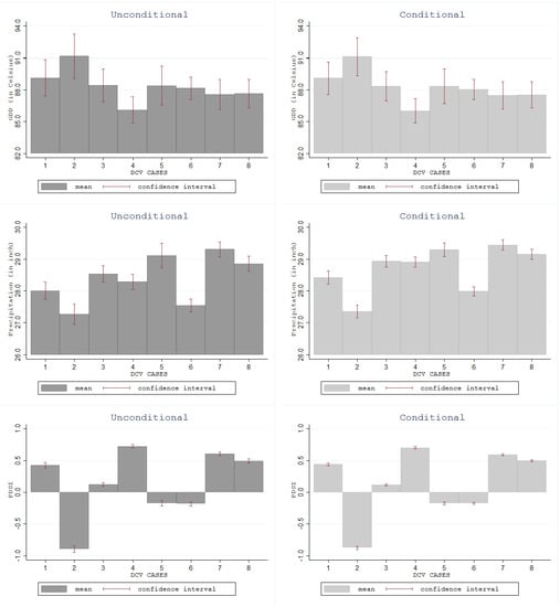 Figure 2 illustrates variations in the mean of growing degree day, precipitation, and PDSI from upper to lower bar graph panels in different DCV phase combinations. The unconditional means are estimated using the raw county-level data for 1950–2015, and the conditional means are obtained from the fitted skew-normal regression with year and county dummy variables. The 95% confidence intervals used here are , where is the standard deviation and is the critical value from the Student’s distribution with , which both statistics were calculated with the effective degree of freedom. The effective degree of freedom followed [34] for , where is the values of autocorrelations at a lag of one year for each DCV case, as similar to [35,36,37]. The conditional means could be slightly different from the unconditional means especially for precipitation possibly due to the skewness in their distribution. Nevertheless, the estimation results of unconditional and conditional mean are consistent across different DCV phase combinations.