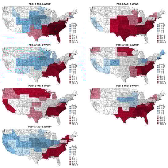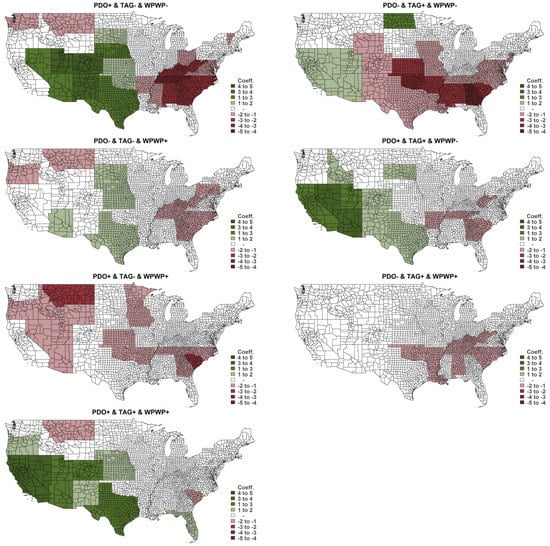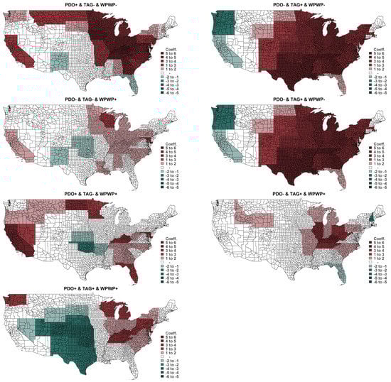 The (PDO+, TAG−, WPWP+) extensively increases growing degree day, decreases rainfall, and increases drought in many contiguous states. The (PDO−, TAG−, WPWP+) phase also increases temperature and decreased rainfall in several states, but the impacts varied by region with lower impacts than the (PDO+, TAG−, WPWP−) and (PDO−, TAG+, WPWP−) phase combinations. All other DCV phase combination impacts are provided in Figure 3, Figure 4 and Figure 5.