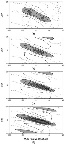 - Kiladis, G.N.; Straub, K.H.; Haertel, P.T. Zonal and vertical structure of the Madden–Julian oscillation. J. Atmos. Sci. 2005, 62, 2790–2809. [Google Scholar] [CrossRef]