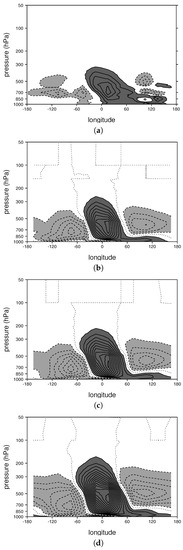For each simulation, composite MJOs are constructed using the method of Haertel et al. [24]. Large-scale, eastward-propagating rainfall anomalies are tracked over the equatorial Indian and West Pacific Oceans, and their vertical and horizontal structures are constructed for initiating, mature, and dissipating stages of the MJO using rawinsonde data. All data are placed in the longitudinal frame of reference of the convective anomaly, so longitude 0 lies as the center of the region of heaviest rainfall (but latitude represents distance from the equator). This method of compositing MJOs is used for the following reasons: (1) the analysis is constructed in the frame of reference of the MJO’s convective anomaly, which is a key for understanding the relationship between convection and surface fluxes, and the sensitivity of the MJO to ocean warming in particular; (2) this is a compositing method that the author developed, so using it provides continuity with prior research; and (3) the resulting composite MJO, which is used to evaluate the modeled MJO, is based entirely on sounding data with no component coming from a model forecast. The observational composite MJO is based on 44 MJO events that occurred between 1996 and 2009, with sounding data coming from the Integrated Global Radiosonde Archive [28] and rainfall data from the Global Precipitation Climatology Project [29]. For more details on the method, the reader is referred to [24].