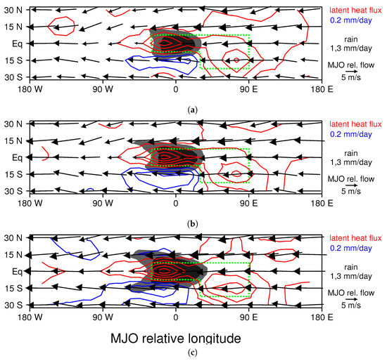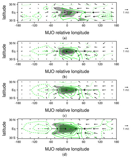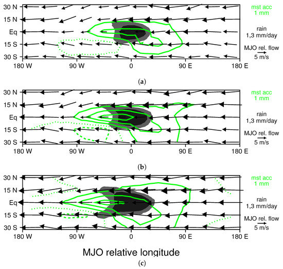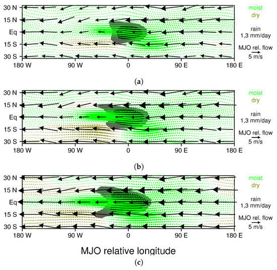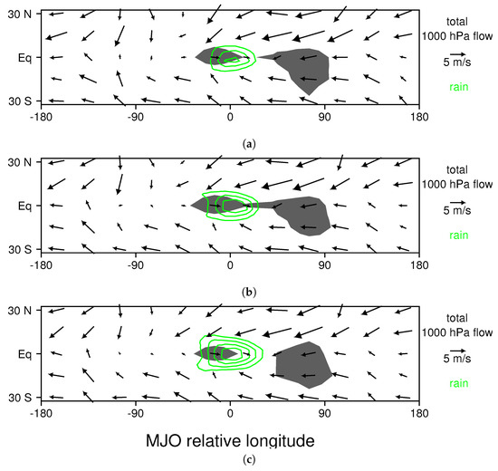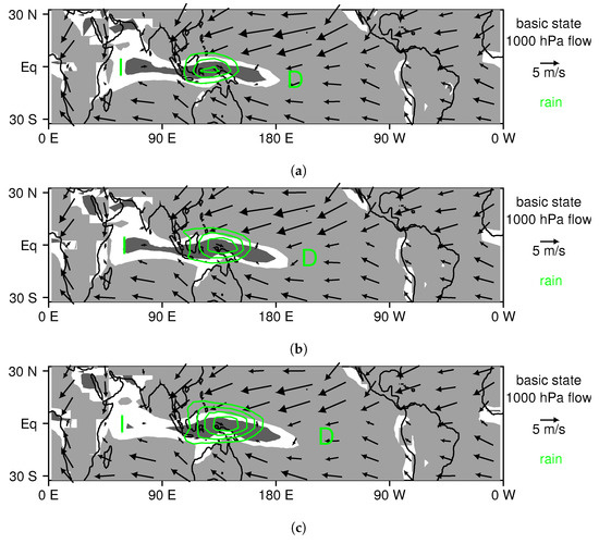One of the key components of the MJO’s mechanism in the LAM is the interaction of its wind perturbations with the basic state flow. Figure 6, Figure 7, Figure 8, Figure 9, Figure 10, Figure 11 and Figure 12 illustrate this point for the mature stage of the MJO. During the time when the MJO is most active in the LAM (November through May), the basic state low-level flow in in the tropics is predominately easterly, with relatively weak meridional wind components that generally converge towards the equator (Figure 6a). However, extending from the central Indian Ocean into the western Pacific, there is a narrow band of weak westerly flow centered near the equator (shaded dark gray region in Figure 6a). The MJO typically forms near the western edge of this westerly flow (note the green “I” indicating the start of initiating stage in Figure 6a), it reaches its maximum intensity near the middle of this band of westerlies (see concentric contours of rainfall for the mature stage of the MJO in green in Figure 6a), and it dissipates just to the east of these westerlies (see the green “D” for the location where the dissipating stage ends in Figure 6a). This westerly wind feature is also present in ocean warming experiments, with a similar relationship to MJO formation, maturation, and dissipation locations, although the dissipation location does shift slightly eastward as the oceans warm (Figure 6b,c). Zhang and Dong [37] noted that the observed MJO also preferentially occurs in regions with surface westerlies.