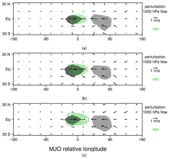 MJO perturbation 1000 hPa flow in MJO relative coordinates for the mature stage of the MJO: (a) the control simulation; (b) the 3 K warming experiment; and (c) the 7 K warming run. Regions where westerly (easterly) wind components exceed 1 m/s in amplitude are shaded dark (light) gray. Perturbation rainfall is contoured in green for 3, 5, 7, and 9 mm/day.