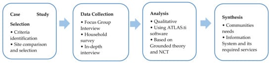 This paper explores the limitations of existing climate change adaptation tools. It investigates the possibility and need for an Information System (IS) through evidence-based design and implementation of CAPs based on relevant and highly granular spatial data and services. Specifically, the paper focuses on mountain communities’ requirements that are relevant for prioritizing services required for Mountain Community Adaptive System (MCAS). In response, the exploratory case study approach was identified as being commensurate to the fulfilment of the aims. A case study can “contribute to our knowledge of individual, group, organizational, social, political and related phenomena” [], such as a mountain community. The use of the exploratory case study, involving primary research, enabled focusing on a specific unit of analysis and a particular location. It enabled the capture and assessment of qualitative data, concerning understanding the limitations of existing tools and potential enhancements enabled by IS. Figure 1 presents the overview of the research methodology conceptually.